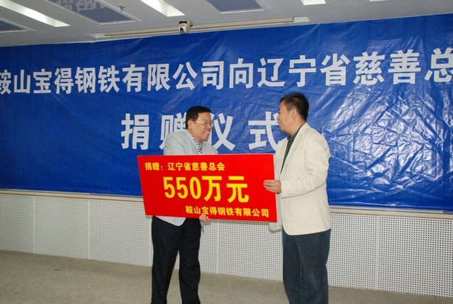 9月23日,公司助學(xué)助老捐贈(zèng)儀式在省慈善總會(huì)隆重舉行。公司總經(jīng)理張鐵漢向省慈善總會(huì)捐贈(zèng)人民幣550萬元,這筆善款將用于鞍山市的助老、捐資助學(xué)等項(xiàng)目。