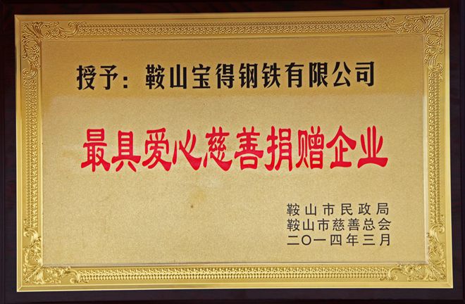 3月7日,在鞍山市慈善總會(huì)第三次會(huì)員大會(huì)上,公司榮獲“最具愛心慈善捐贈(zèng)企業(yè)”、“最具影響力慈善項(xiàng)目”榮譽(yù),董事長(zhǎng)榮獲“最具愛愛心慈善楷模”榮譽(yù)稱號(hào)。