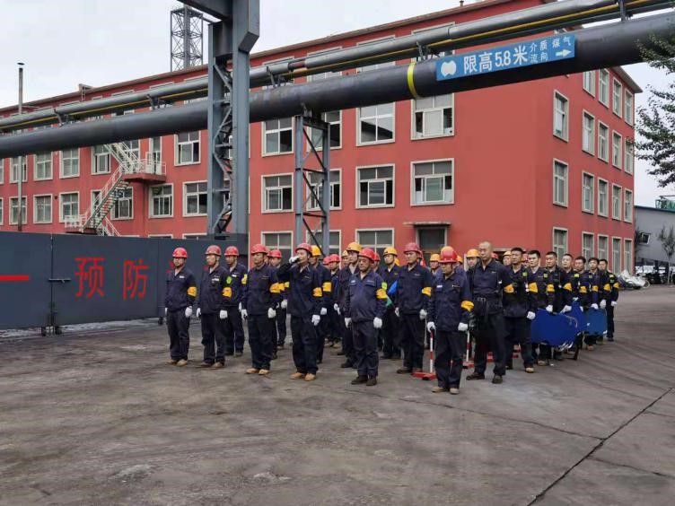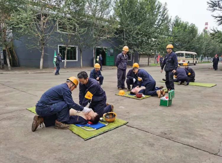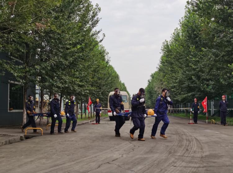 “報(bào)告馬廠長(zhǎng):我是當(dāng)班維護(hù)班長(zhǎng)曹雷,9點(diǎn)35分左右班內(nèi)三名員工在煤氣閥組平臺(tái)巡檢過(guò)程中發(fā)生煤氣中毒事故,請(qǐng)求立即支援”……;“請(qǐng)搶險(xiǎn)救援組、安全警戒組、醫(yī)療救護(hù)組…立即趕赴事故現(xiàn)場(chǎng)集結(jié)”;“報(bào)告總指揮:搶險(xiǎn)救援組10人到達(dá)現(xiàn)場(chǎng),6套呼吸器及3副擔(dān)架救援裝備完好,可正常使用”……;“各救援小組按預(yù)案規(guī)定程序及商定的實(shí)施方案,立即展開(kāi)救援行動(dòng)”……;“報(bào)告總指揮:三名傷者已成功救出,兩人中毒較重,一人較輕,……”;“報(bào)告總指揮:煤氣泄漏部位搶修完畢,已無(wú)泄漏現(xiàn)象,設(shè)備可正常運(yùn)行”……。隨著一條條救援指令的下達(dá),現(xiàn)場(chǎng)警戒、現(xiàn)場(chǎng)救援、傷員急救、設(shè)備搶修、現(xiàn)場(chǎng)清理及組織生產(chǎn)恢復(fù)等過(guò)程緊張、有序地完成,實(shí)戰(zhàn)演練圓滿結(jié)束。